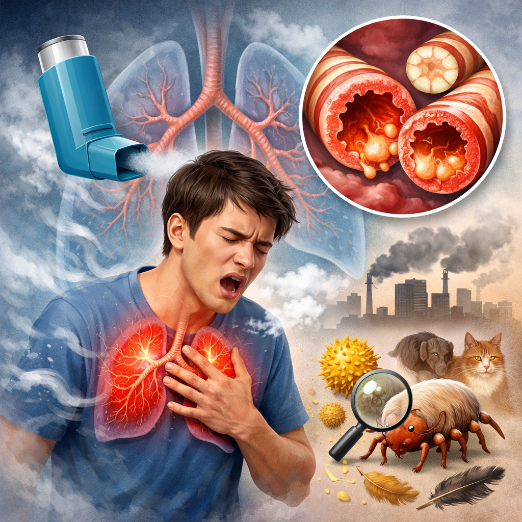 حساسية الصدر (الربو التحسسي) هي التهاب مزمن في الممرات الهوائية يحدث نتيجة رد فعل مناعي مفرط تجاه مهيجات كحبوب اللقاح، الغبار، أو الروائح القوية. تشمل أعراضها الرئيسية السعال المتكرر (خاصة ليلاً)، ضيق التنفس، صوت صفير (أزيز) عند التنفس، وثقل في الصدر، ويمكن السيطرة عليها عبر بخاخات العلاج وتجنب المسببات.