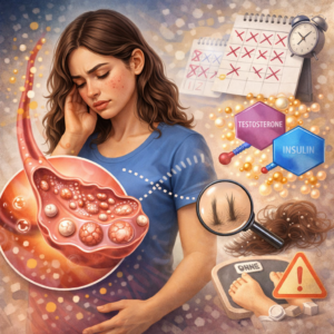 متلازمة تكيس المبايض: ما وراء اضطراب الهرمونات تُصنف متلازمة تكيس المبايض كواحدة من أكثر الاضطرابات الغدية شيوعاً لدى النساء في سن الإنجاب. طبياً، لا تعني هذه الحالة وجود “أكياس” بالمعنى التقليدي، بل هي تجمع لجريبات صغيرة غير ناضجة في المبيض، ناتجة عن خلل في التوازن الهرموني. العلامات السريرية الشائعة تظهر المتلازمة غالباً من خلال ثلاثة مؤشرات رئيسية: 1. اضطراب الدورة الشهرية: تباعد الفترات أو انقطاعها. 2. فرط الأندروجين: ويظهر سريرياً من خلال ظهور حب الشباب، أو تساقط شعر الرأس، أو نمو الشعر الزائد في الجسم. 3. المظهر التصويري: رؤية تكيسات صغيرة عبر الأشعة الصوتية (Ultrasound). المخاطر والحلول الطبية ترتبط هذه المتلازمة غالباً بـ “مقاومة الإنسولين”، مما يجعل المصابات أكثر عرضة لزيادة الوزن وصعوبة فقدانه. يعتمد العلاج بشكل أساسي على “تعديل نمط الحياة” عبر الغذاء والرياضة، بالإضافة إلى التدخلات الدوائية لتنظيم الدورة أو تحفيز التبويض في حال الرغبة بالحمل