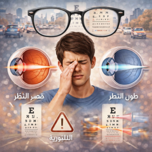 أخطاء الانكسار: عندما لا تصل الصورة بوضوح تحدث أخطاء الانكسار عندما لا يتمكن شكل العين من ثني الضوء بشكل صحيح، مما يؤدي إلى تركيز الصورة في مكان خاطئ بالنسبة للشبكية، بدلاً من السقوط عليها مباشرة. الأنواع السريرية الثلاثة: 1. قصر النظر (Myopia): حيث تتركز الصورة أمام الشبكية، مما يجعل الأشياء البعيدة تبدو مشوشة. أصبح هذا النوع “وباءً” حديثاً بسبب زيادة استخدام الشاشات والعمل القريب. 2. طول النظر (Hyperopia): تتركز الصورة خلف الشبكية، مما يسبب إجهاداً للعين وصعوبة في التركيز على الأشياء القريبة. 3. الاستجماتيزم (Astigmatism): ناتج عن عدم انتظام شكل القرنية، مما يؤدي إلى تشتت الضوء في عدة نقاط ورؤية مشوشة على كافة المسافات. الحلول الطبية والتقنية يعتمد البروتوكول العلاجي الحديث على ثلاث ركائز: * التصحيح البصري: استخدام النظارات أو العدسات اللاصقة لضبط مسار الضوء. * الجراحة الانكسارية: مثل “الليزك” (LASIK)، لتعديل شكل القرنية بشكل دائم. * الوقاية: اتباع قاعدة “20-20-20” (كل 20 دقيقة عمل، انظر لمسافة 20 قدماً لمدة 20 ثانية) لتقليل إجهاد العين الرقمي.